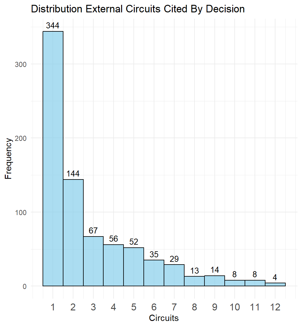 Now to see the frequency of number of circuits cited, the following graph is a histogram capturing the 774 decisions citing an external circuit based on the number of circuits cited so, for example, a decision from the Fifth Circuit citing four decisions from the Sixth Circuit, three from the Seventh, and two from the Eighth would lead to an output of three because of the three circuits cited. I did not track the number of cites to specific external circuits within decisions and only coded if an external circuit’s decision was cited within the decision from a given observation.