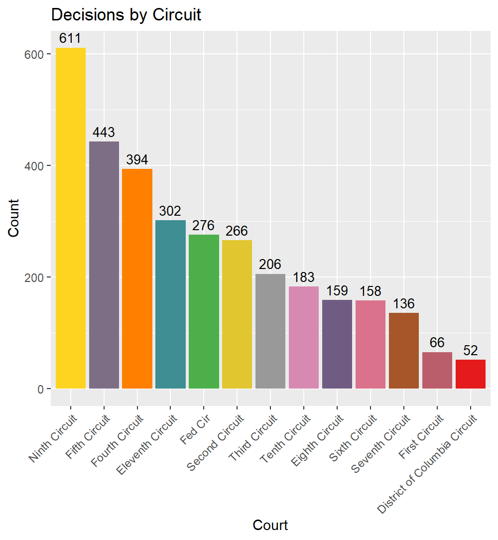 This showed that 774 of the decisions had at least one external circuit cited and more than half of the observations, 2,060 in all, were per curiam or unsigned. Below is the number of decisions per circuit which more or less parallels expectations with the circuits with the highest decision counts as the Ninth and Fifth and the fewest decisions coming from the DC and First Circuits.