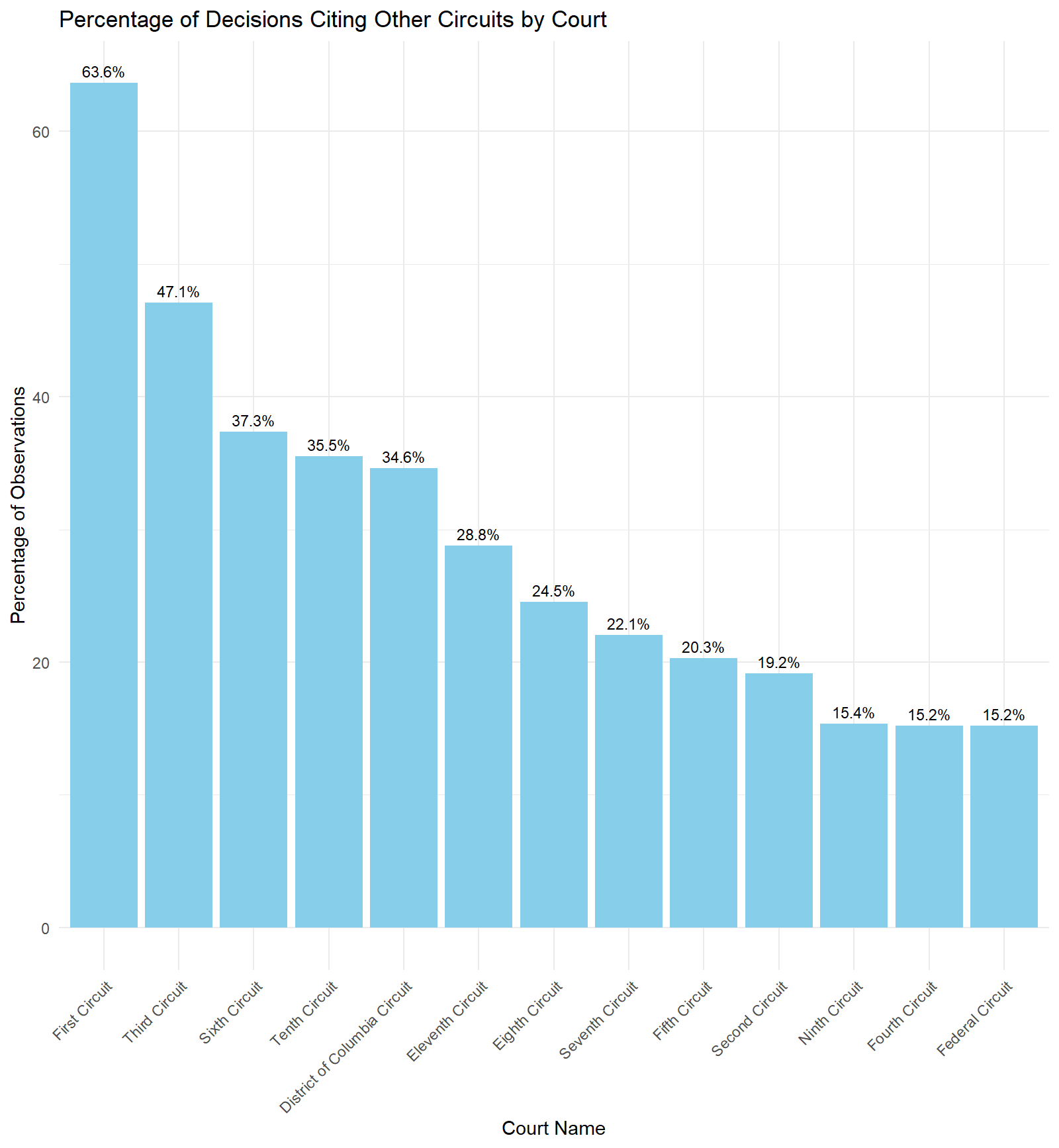 The First Circuit, a smaller circuit, is the heaviest citing circuit to other circuits while the subject matter specific Federal Circuit unsurprisingly has the lowest percentage of external citations along with the Fourth Circuit. The Ninth Circuit which is the largest geographic circuit with quite an established set of intracircuit precedent has nearly the lowest percentage of decisions with inter-circuit citations.