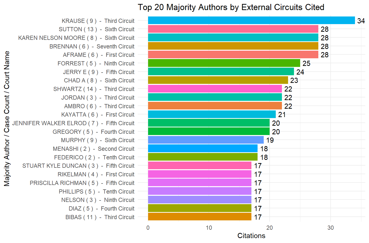 Third Circuit Judge Krause has the most inter-circuit citations by a six circuit count margin across nine opinions. Then Judge Sutton, Moore, Brennan, and Aframe all have 28 inter-circuit citations, but from varying numbers of their own opinions. To normalize these numbers, the next graph uses the same judges, but divides the external circuits cited by the number of decisions in parentheses to get a rate of inter-circuit citations per majority opinion.
