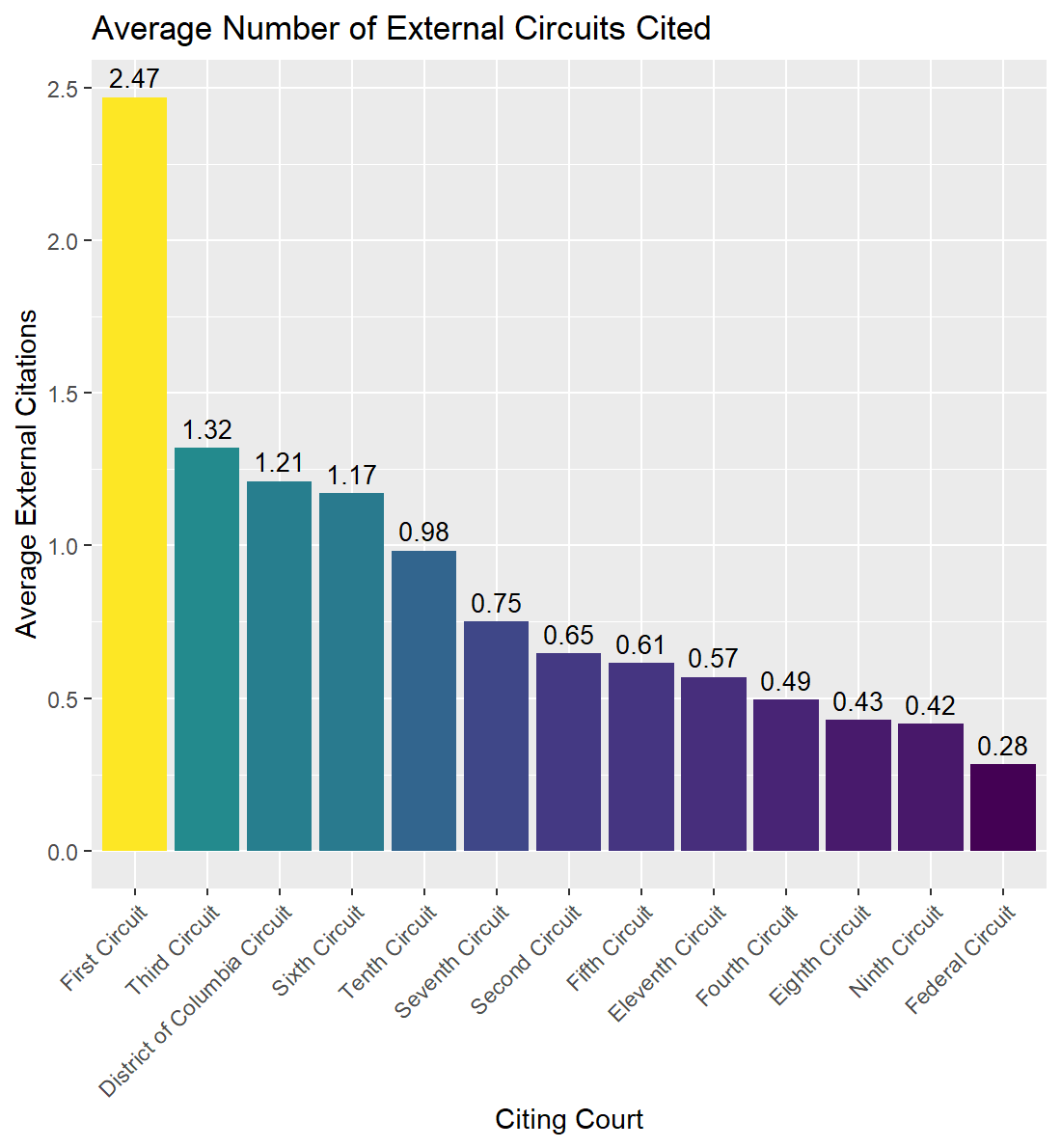 The First Circuit also cites the most other circuits in its decisions based on the count of circuits cited and not only the binary of if a decision has inter-circuit citations or not. There is a big drop off to the other circuits and like the other graphs, Federal Circuit decisions also cite the fewest number of external circuits per decision.