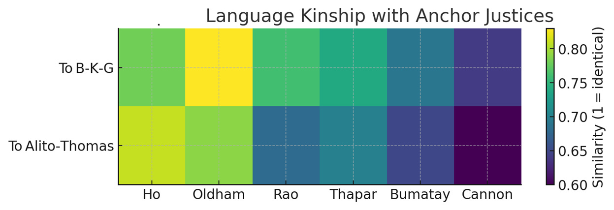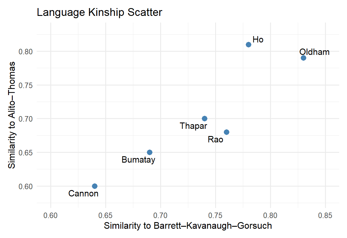 Oldham’s linguistic choices are quite close to those of Barrett and Kavanaugh draft; Ho’s is even nearer to Alito and Thomas. Cannon’s district-court orders read differently—plainer, shorter, fewer constitutional flourishes—so the model finds less overlap.