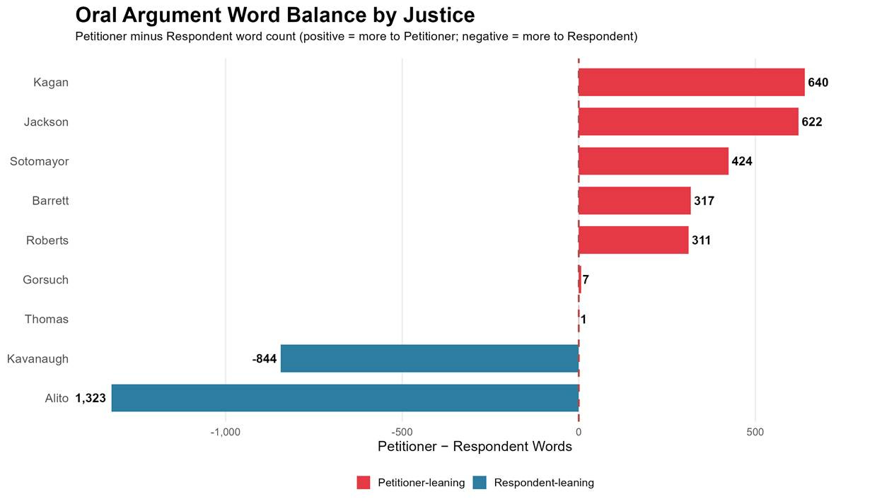 One empirical method for assessing judicial leanings is to analyze not just the content of questions but their volume and direction. Justices tend to ask more questions of the side they’re skeptical of—testing arguments, probing for weaknesses, searching for limiting principles. Conversely, they ask fewer questions of the side they’re inclined to support, saving their questions for clarifying points they find persuasive.
