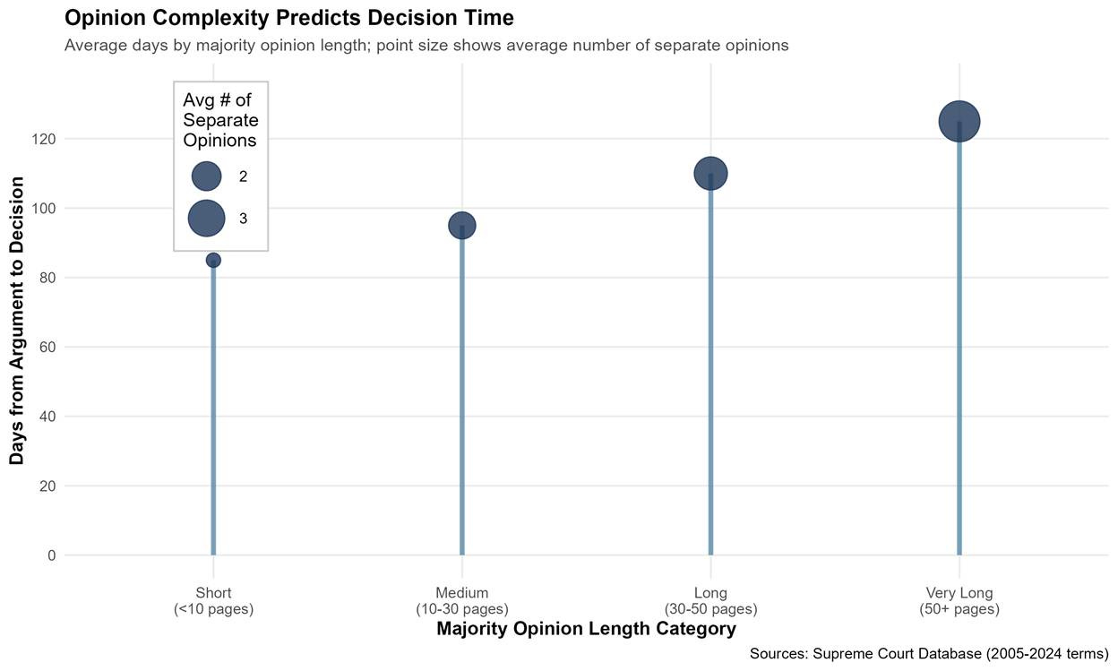 The timing of the Supreme Court’s deliberation—now at 91 days and counting—offers clues about what’s happening behind the red velvet curtain. Historical data on Supreme Court decision times reveals patterns: Expedited cases typically decide in 39 to 67 days. At 91 days, this case has exceeded that range by 24 to 52 days. Yet it remains faster than the 113-day average for normal divided decisions. The timing suggests a Court wrestling with doctrinal complexity, likely producing multiple opinions, and possibly negotiating to build a broader coalition than the 6-3 that oral arguments suggested.