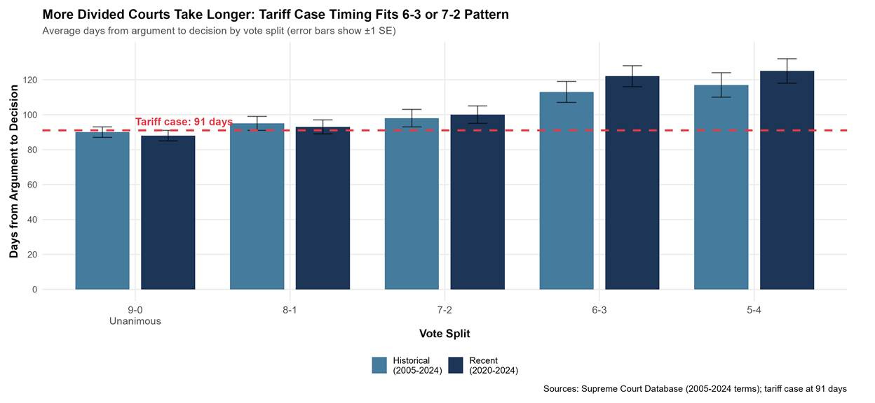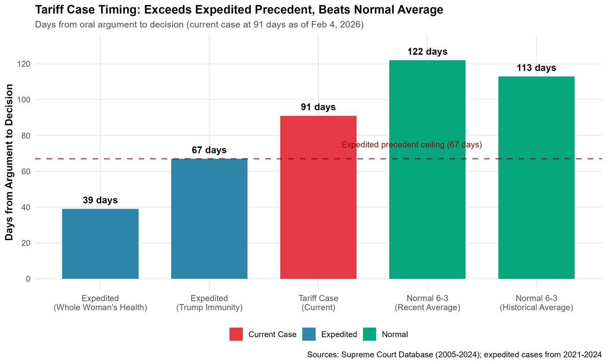At 91 days since oral arguments (as of February 4, 2026), the tariff case occupies a curious position in Supreme Court timing patterns. It has significantly exceeded the historical precedent for expedited cases but remains ahead of the normal pace for divided decisions. Understanding what this timing signals requires examining Supreme Court decision patterns across multiple dimensions: expedited versus normal processing, vote splits, opinion length and complexity, and justice-specific writing speeds.