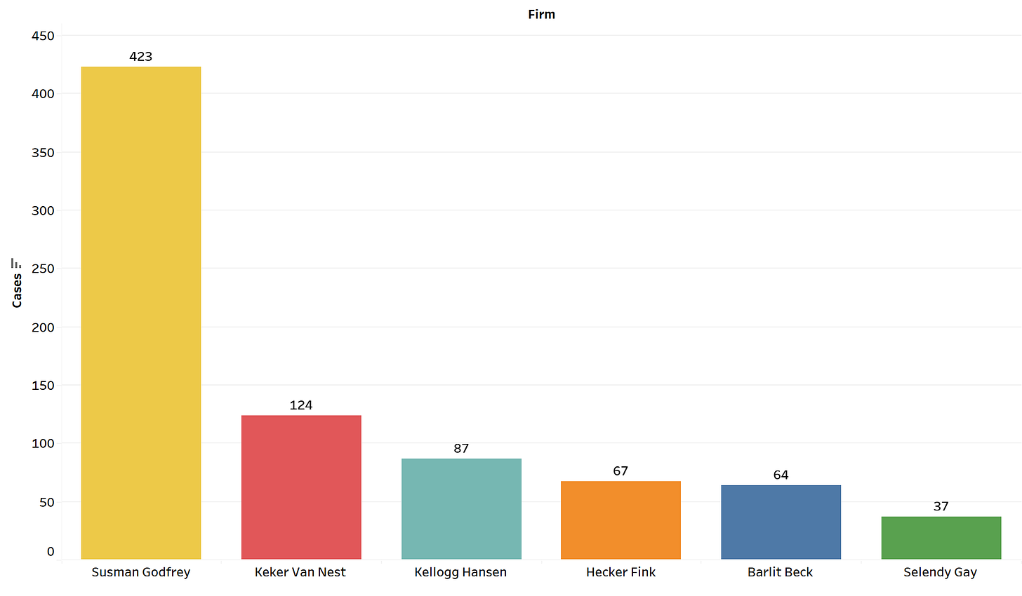 Susman Godfrey’s size and geographic diversity help explain the larger share of litigation.